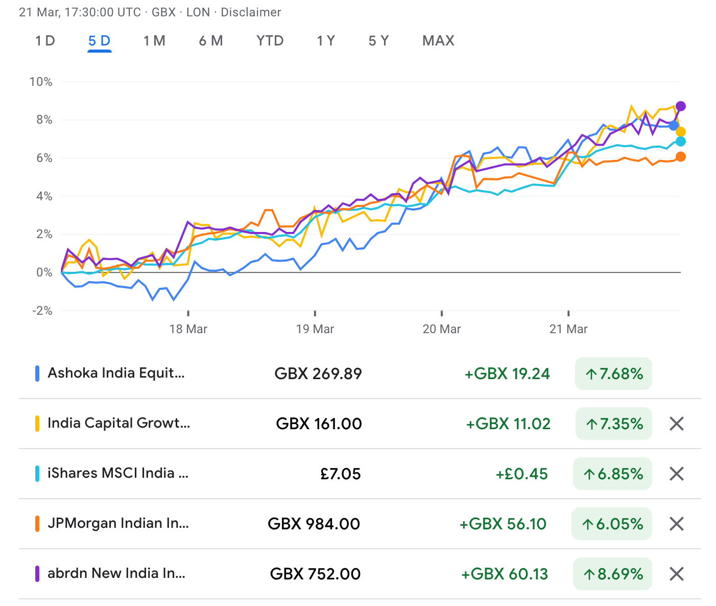 Well, karma kicked in. Indian stocks just had their best week in four years, and the rupee strengthened too. For UK-based investors, that’s been good for a tidy 7-8% return, whether you’re riding ETFs or more actively managed vehicles.