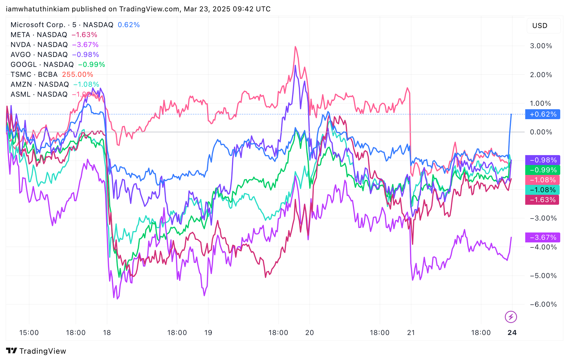 Corporate earnings aren’t exactly helping the mood either. Nike, Delta, FedEx—they’re all waving the “we’ve got tariff problems” flag. Oh, and DOGE? It’s not just a meme anymore; it’s a punchline in boardrooms such as those of Accenture. And if you thought AI was immune, think again. The AI bubble is slowly deflating like a sad balloon at a kid’s birthday party. Just look at the top tech players: Microsoft, Alphabet, Broadcom, TSMC, ASML, Amazon, Meta, Nvidia. Only Microsoft eked out a tiny 0.62% gain last week—probably from sheer willpower. Most were down - at one stage as much as by 6%.